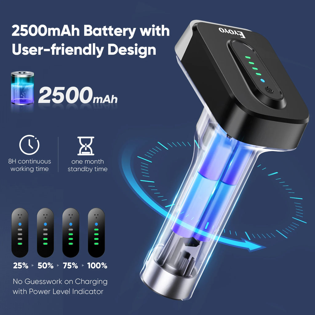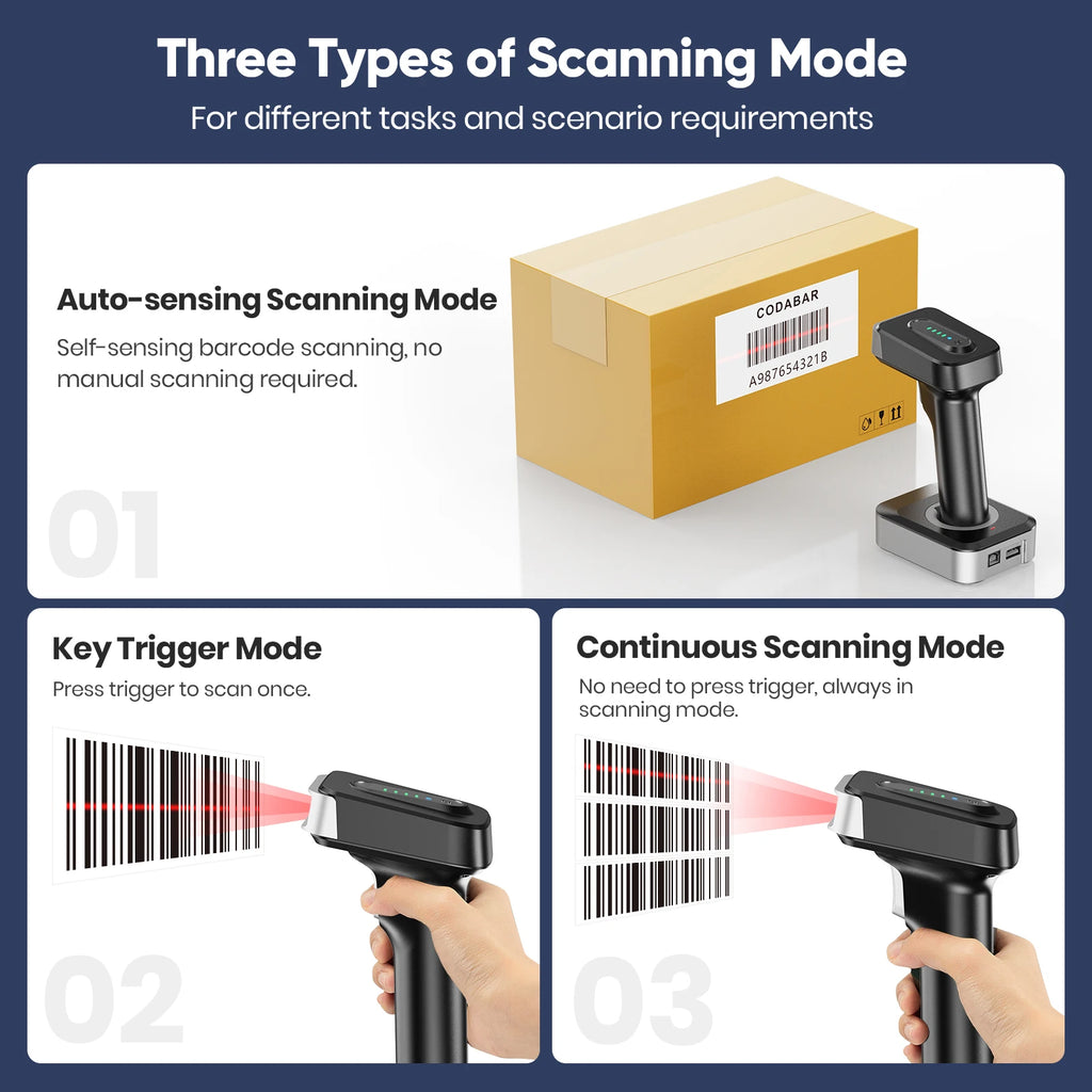 The scanner is compatible with Windows XP/7/8/10, Mac OS, Android, iOS, and Linux, and works with PCs, laptops, mobile devices, tablets, and POS systems. It handles even challenging barcodes, such as those on dirty, creased, or faded labels, and can read up to 120 barcodes per minute in manual mode. The 2500mAh battery allows for up to 8 hours of continuous use and a standby time of up to 30 days. Up to 100,000 barcodes can be stored in offline memory mode.