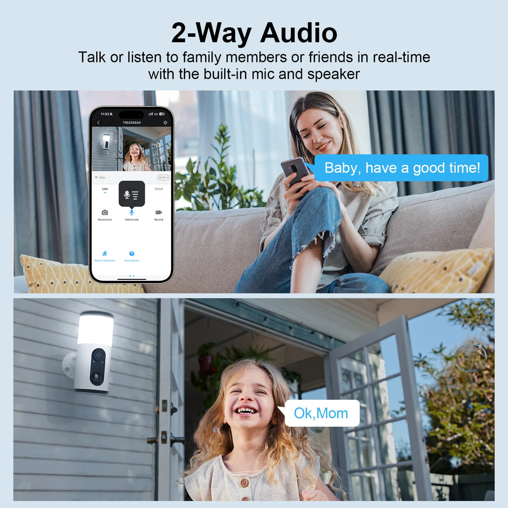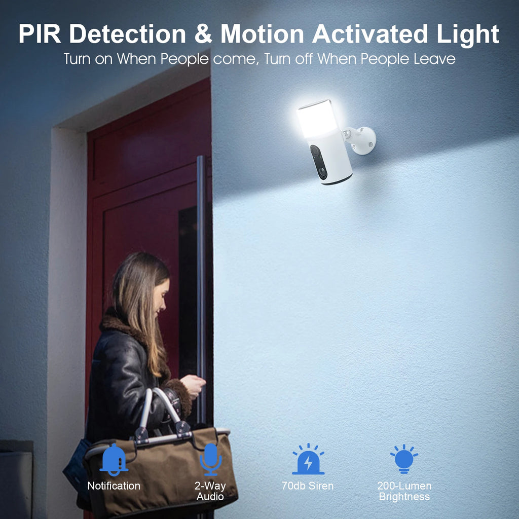 Mit 20 eingebauten LED-Leuchten und 200 Lumen bietet die Kamera nicht nur Überwachung, sondern auch praktische Beleuchtung. Die Installation erfolgt einfach und flexibel an der Wand. Zwei-Wege-Audio ermöglicht eine klare Kommunikation über die App, sodass Sie jederzeit mit Besuchern oder Lieferanten sprechen können. Die Kamera unterstützt sowohl Cloud-Speicherung mit 7 Tagen kostenlosem Speicherplatz als auch lokale Speicherung auf SD-Karten von 8 bis 128 GB (nicht im Lieferumfang enthalten).