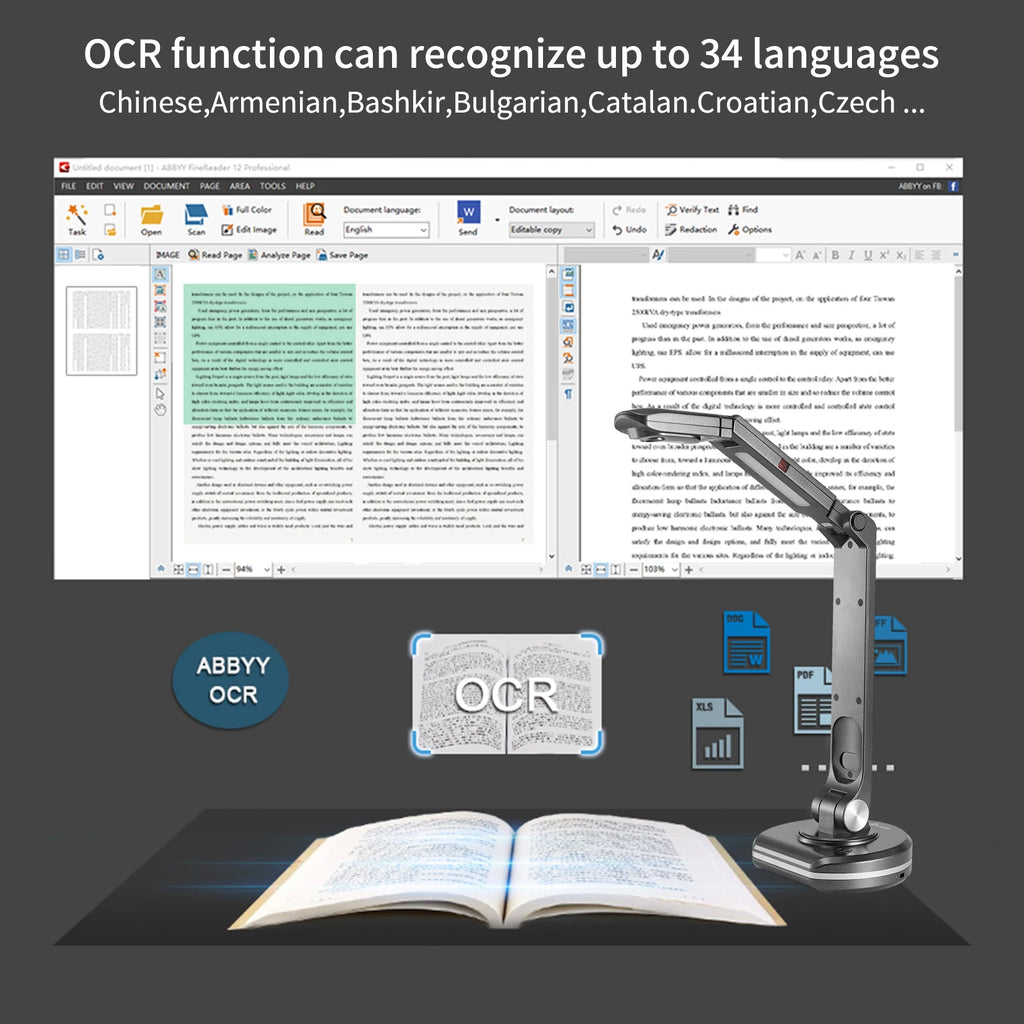 Der Scanner unterstützt eine intelligente OCR-Funktion, die über 34 Sprachen erkennt und gescannte Bilder automatisch in editierbare Textdateien umwandelt. Zusätzlich sind Funktionen wie Hintergrundentfernung, automatische Korrektur und Kantenglättung integriert. Das Gerät ist kompatibel mit Mac, Windows, Chromebook und Chrome OS und benötigt nur eine USB-Verbindung zur einfachen Plug & Play Nutzung. Die Software kann über bereitgestellte Links schnell heruntergeladen werden.