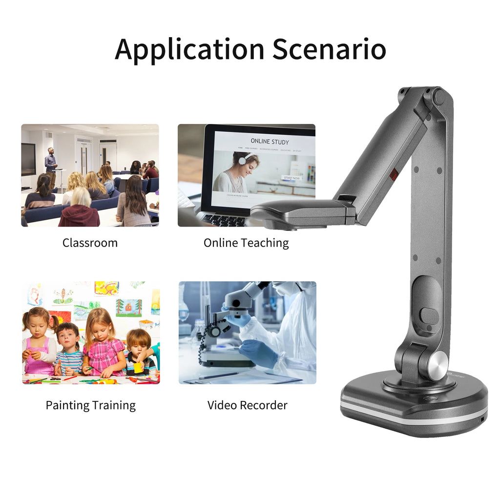 Der V500s Dokumentenscanner und Buchscanner kombiniert vielseitige Einsatzmöglichkeiten für Zuhause, Büro und Online-Unterricht. Er eignet sich ideal als Computer-Kamera, Spielkamera oder für Online-Präsentationen. Mit seinem robusten Multi-Gelenk-Design und fünf frei beweglichen Gelenken lassen sich Objekte aus unterschiedlichen Winkeln aufnehmen. Der 8-Megapixel-CMOS-Sensor liefert klare und detaillierte Bilder in HD-Auflösung (1080p) mit einer Bildrate von 30 fps und einer maximalen Scanfläche bis zu A3 (420 x 297 mm).