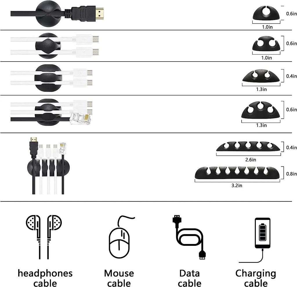 Das Set enthält verschiedene Größen und Typen von Kabelclips, die für USB-Kabel, Ladekabel, Audiokabel, Netzwerkkabel und andere Kabeltypen geeignet sind. Die Clips lassen sich einfach auf glatten Oberflächen befestigen und bei Bedarf wieder entfernen, ohne Rückstände zu hinterlassen. Ideal für Schreibtische, Fernseher, Arbeitsplätze oder Fahrzeuginnenräume.