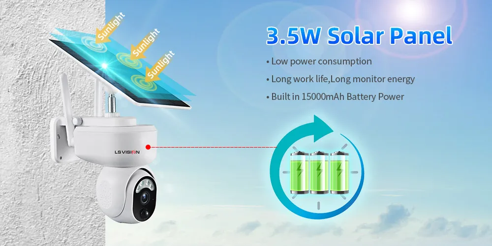 Für die Stromversorgung ist ein leistungsstarker 15000-mAh-Akku eingebaut, der von einem 3,5-Watt-Solarpanel unterstützt wird. Die Solarpanel kann separat an einem sonnigen Standort mit dem mitgelieferten 3-Meter-Verlängerungskabel installiert werden, um die Kamera kontinuierlich mit Energie zu versorgen. Dadurch ist ein kabelloser Betrieb mit geringem Stromverbrauch und langer Lebensdauer möglich.