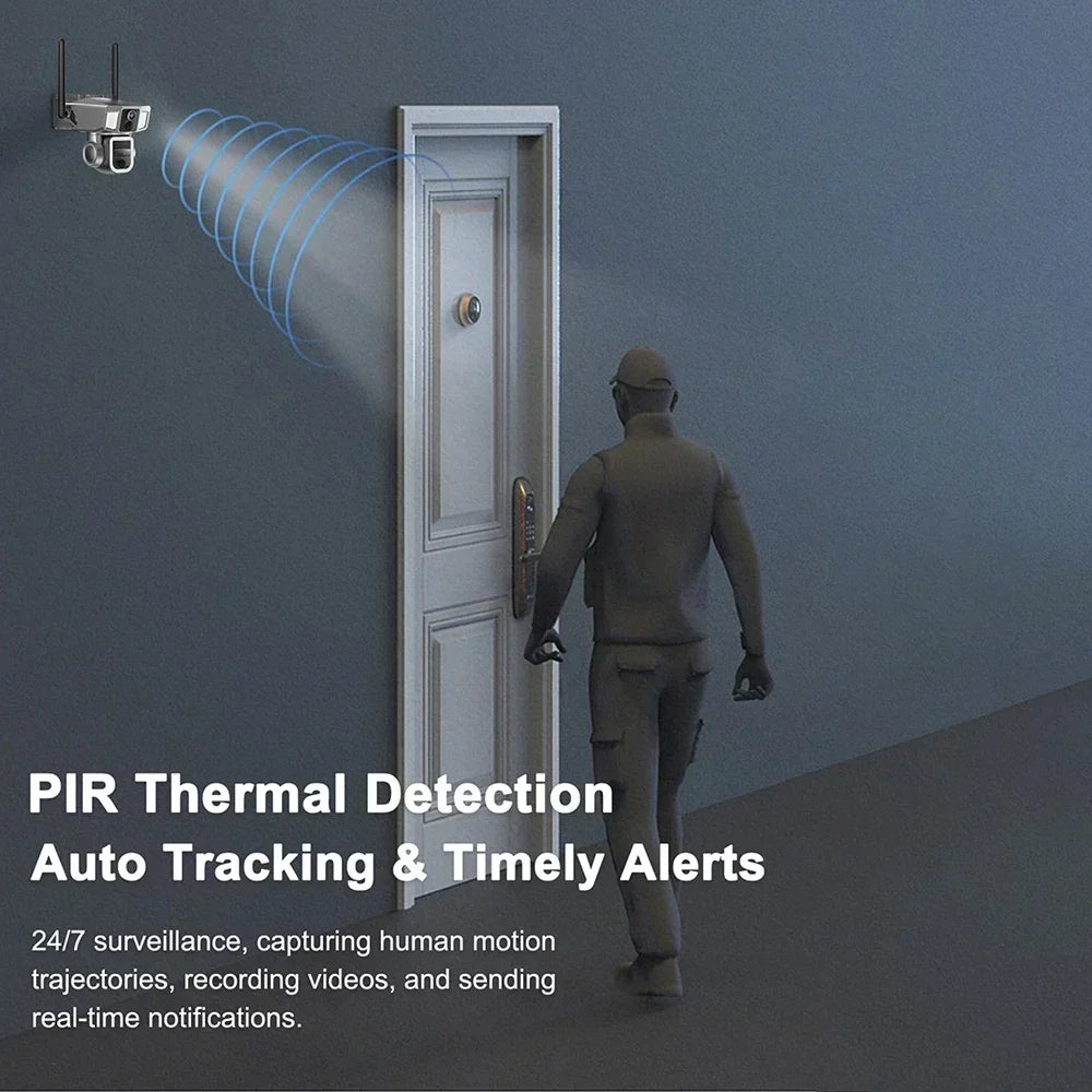 Die Kamera unterstützt menschliche Erkennung durch PIR-Sensoren, die präzise Bewegungen erkennen und Fehlalarme reduzieren. Automatische Verfolgung sorgt dafür, dass sich bewegende Personen zuverlässig im Blickfeld bleiben. Dank IP66 Schutz ist die Kamera gegen Staub und Wasser geschützt und somit ideal für den Einsatz im Freien, selbst bei extremen Wetterbedingungen von -20 °C bis 50 °C.