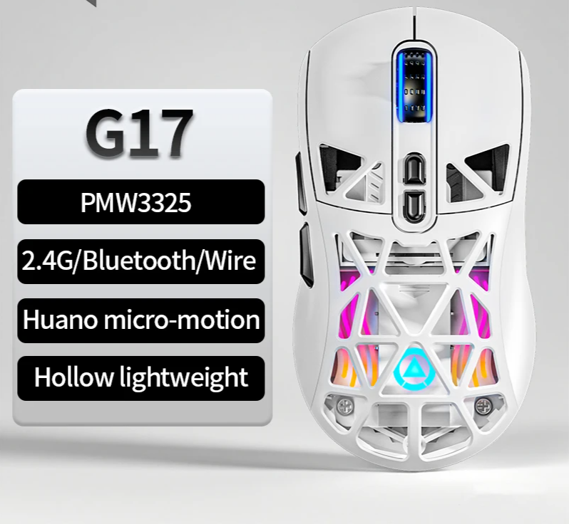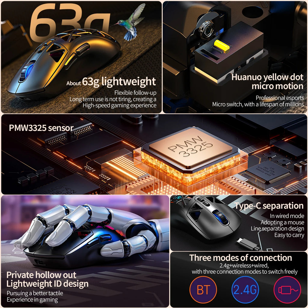 Diese leichte kabellose Gaming-Maus mit Dreifach-Modus (Bluetooth, 2.4G und Kabelverbindung) bietet höchste Flexibilität und Leistung für Gaming, Büro oder den Alltag. Dank integriertem Akku ist die Maus wiederaufladbar und umweltfreundlich – ganz ohne Batterien.