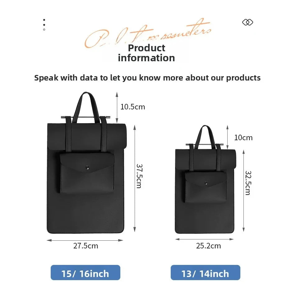 Erhältlich in stilvollen Farben – Schwarz, Graublau und Braun – passt sie perfekt zu jedem Look. Durch ihr leichtes Gewicht von nur 350–400 g und die präzisen Maße (13/14 Zoll = 32,5 x 25,5 cm, 14,1/16 Zoll = 37,5 x 27,5 cm) ist sie ideal zum Mitnehmen im Rucksack oder in der Handtasche.