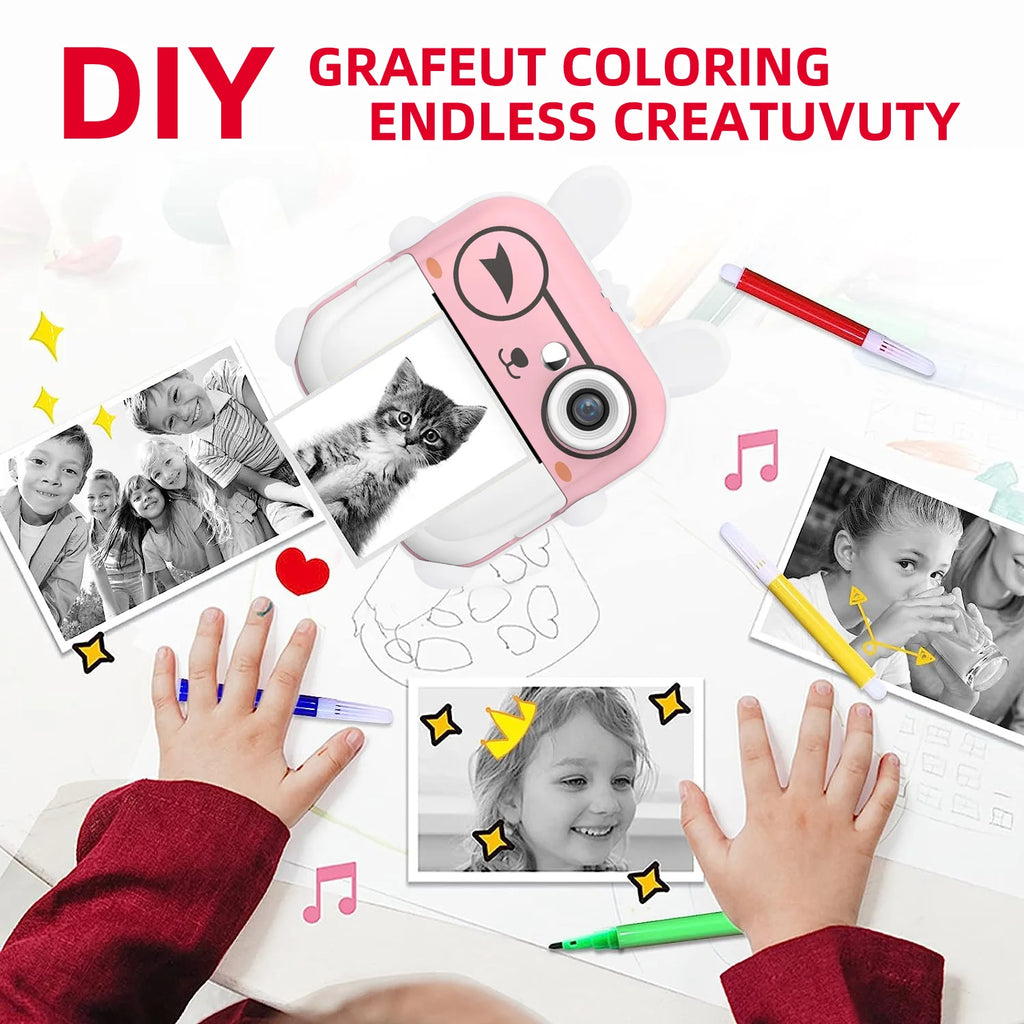 Diese Kinder-Instant-Digitalkamera bietet Spaß und Kreativität in einem. Mit einem 2,4 Zoll IPS Bildschirm, einer Bildauflösung von 24 MP und Videofunktion in Full HD (1920×1080px) können Kinder ihre Welt in lebendigen Bildern festhalten. Die Kamera unterstützt Thermodruck mit einer Druckauflösung von 203 dpi auf Thermopapier mit einer effektiven Breite von 48 mm und einer Papierbreite von 58 mm.