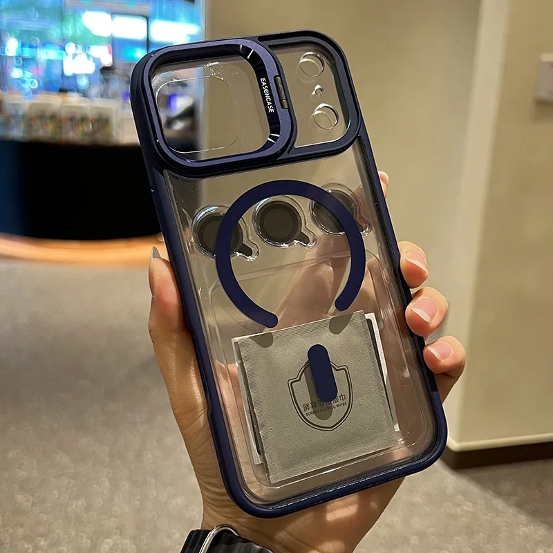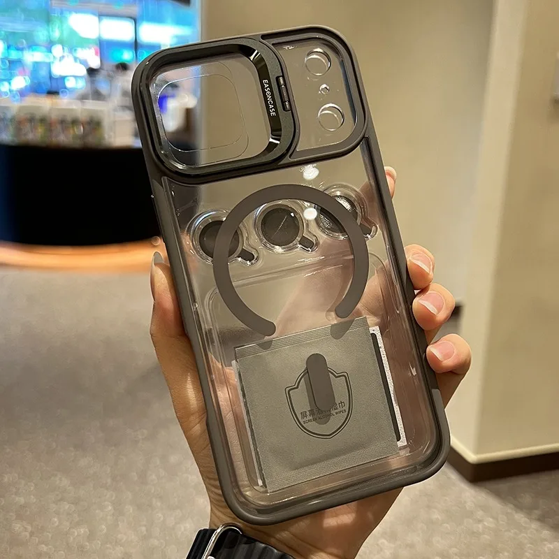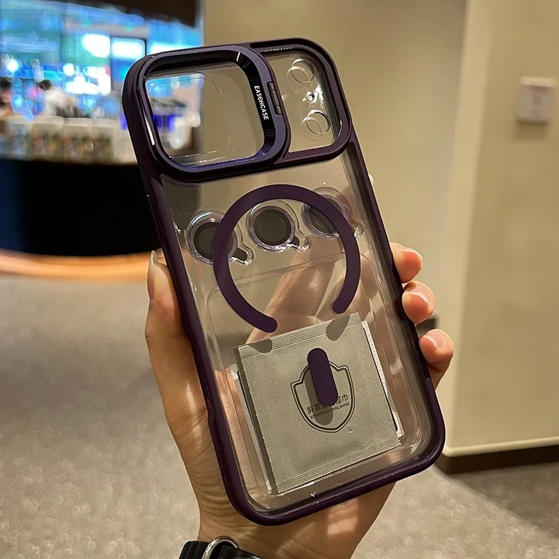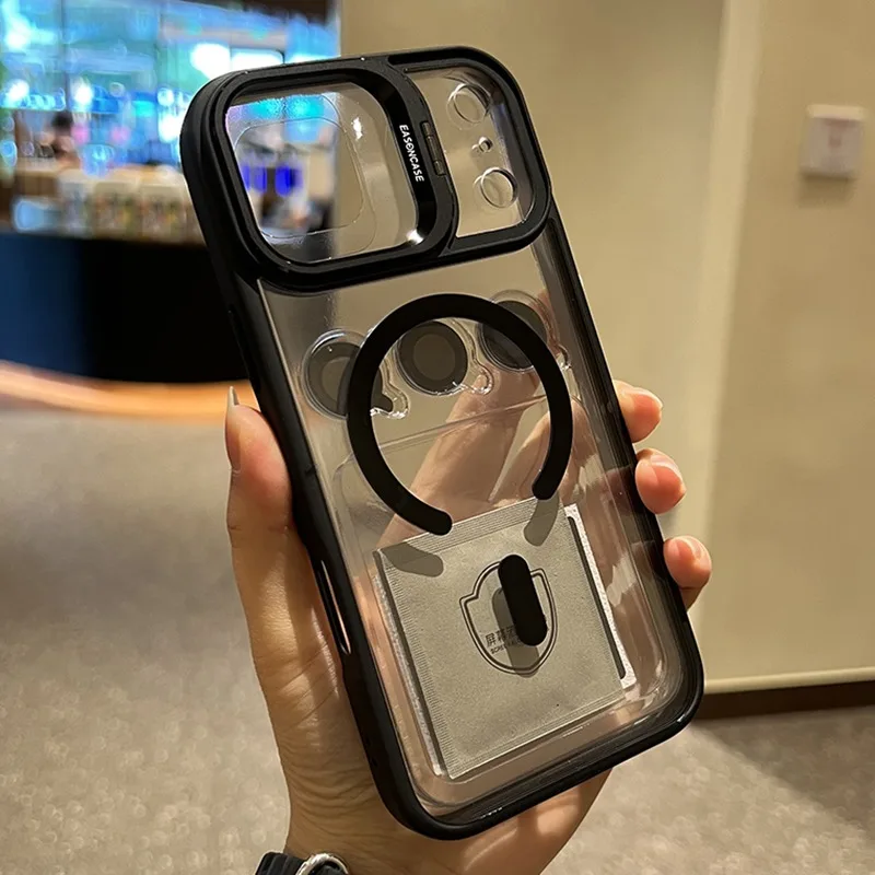 Die Hülle verfügt über eine integrierte magnetische Rückseite, die kompatibel mit MagSafe-Zubehör ist. So kannst du dein iPhone bequem mit magnetischen Ladegeräten oder Haltern verwenden. Zusätzlich ist ein praktischer Standhalter integriert, der das Freihalten des Smartphones im Querformat ermöglicht – ideal für Videoanrufe oder Streaming.
