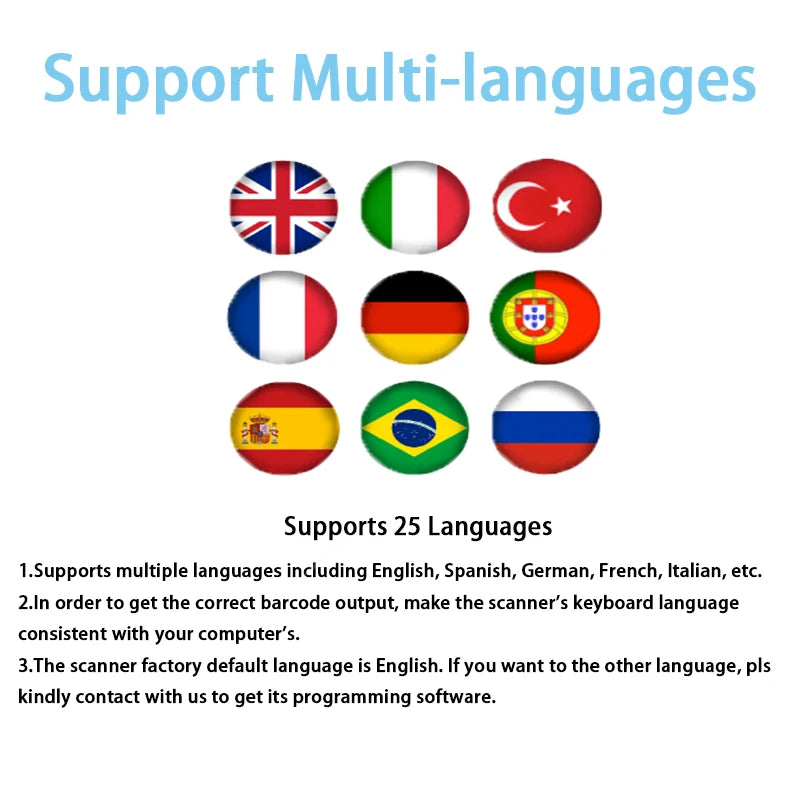 Dank der flexiblen Verbindungsmöglichkeiten kann der Scanner über USB, 2,4G drahtlos oder Bluetooth mit Computern, Laptops oder mobilen Geräten verbunden werden. Die Plug-and-Play-Funktionalität erfordert keine zusätzlichen Treiber, was die Einrichtung schnell und unkompliziert macht. Der Scanner unterstützt mehrere Sprachen und vollständige ASCII-Zeichenbearbeitung, sodass er weltweit eingesetzt werden kann.