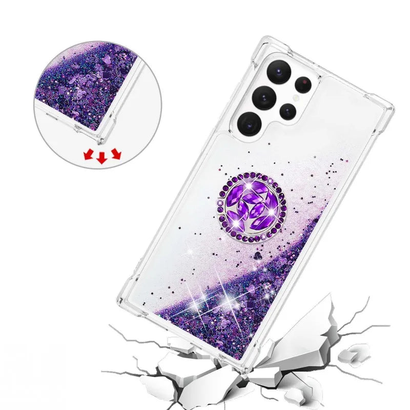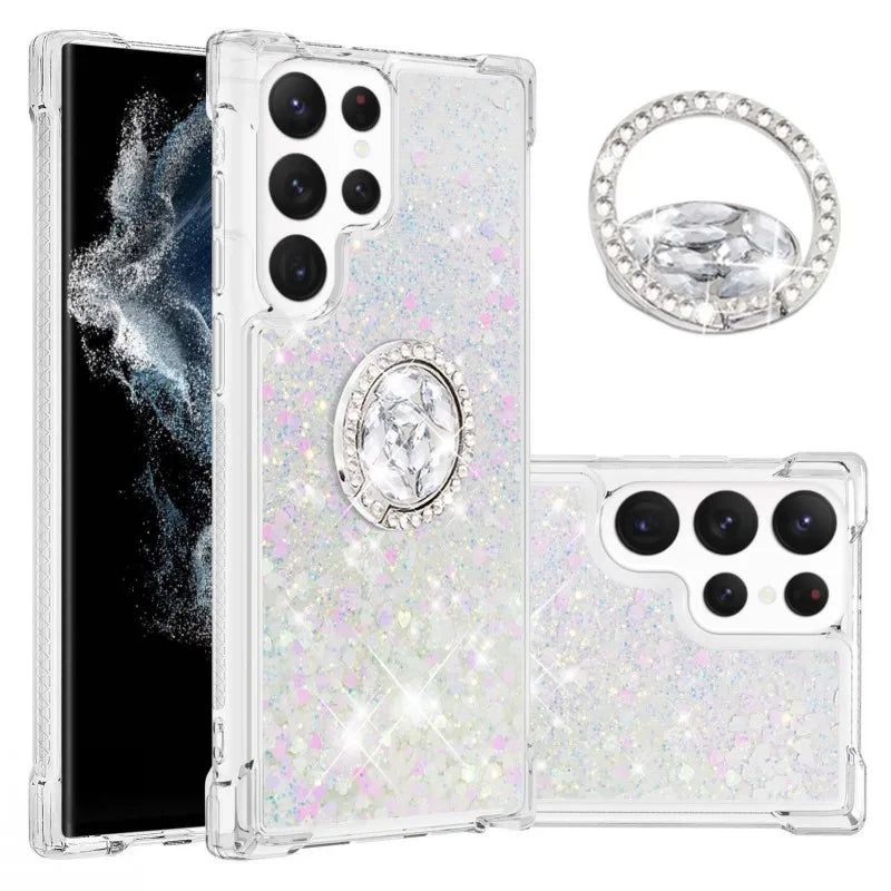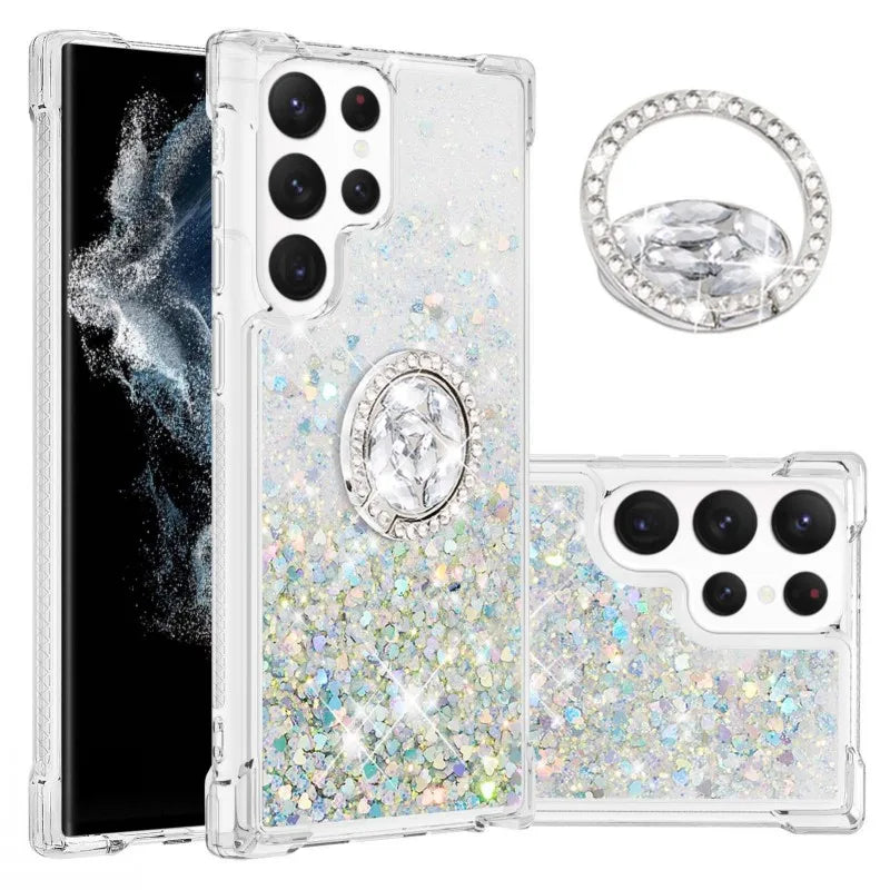 Diese modische Treibsand-Glitzerhülle mit integriertem Ringhalter wurde speziell für das Samsung Galaxy S24 und S25 entwickelt, einschließlich der Ultra- und Plus-Modelle. Das halb umwickelte Design sorgt für einen sicheren Halt und eine elegante Passform, während die flüssige Glitzerfüllung im Inneren bei jeder Bewegung schimmert und ein visuelles Highlight bietet.