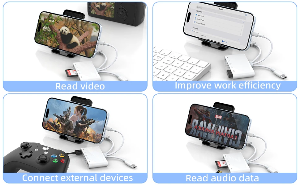 Dieser 2-in-1 SD- und MicroSD-Kartenleser mit Typ-C-Anschluss ist ideal für iPhone, iPad, Android-Geräte und Computer. Er unterstützt SD, microSD, SDHC und SDXC-Karten bis zu 1 TB Kapazität. Mit eingebautem Lightning-Ladeanschluss können Sie iOS-Geräte während der Datenübertragung aufladen. Die Zwei-Wege-Hochgeschwindigkeitsübertragung ermöglicht schnelles Lesen und Schreiben zwischen Karten und Geräten. Plug-and-Play-Funktionalität erfordert keine zusätzliche App, unterstützt aber die iOS-Dateien-App.