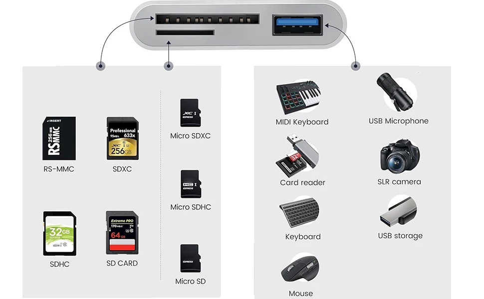 • Unterstützt SD, microSD, SDHC, SDXC bis zu 1 TB